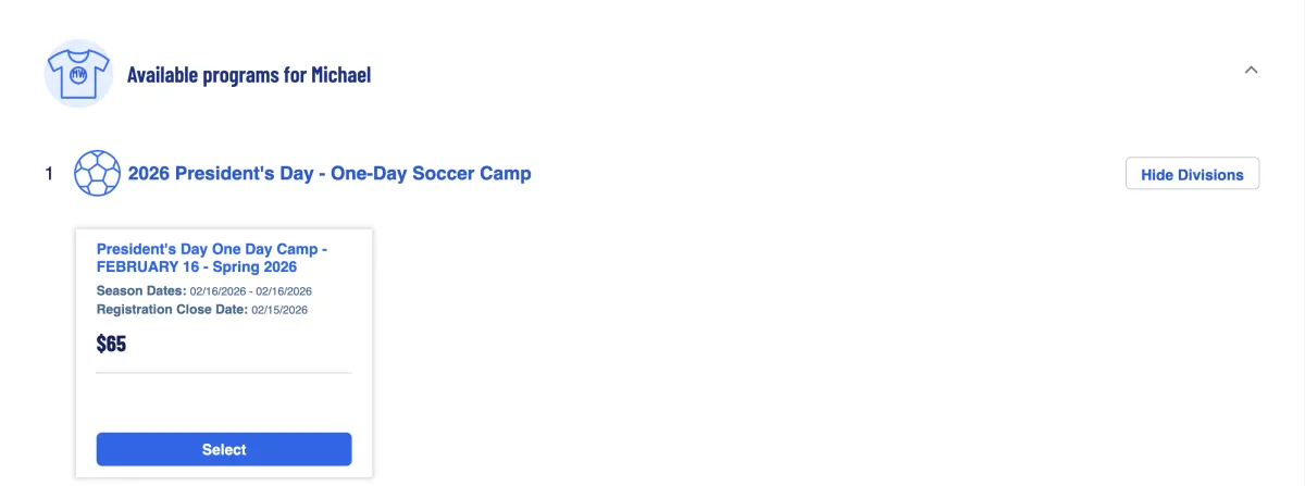 You'll see all the available programs for your player - select "2026 President's Day - One-Day Soccer Camp" and then click the blue "Select" button on the Monday, February 16th division card.